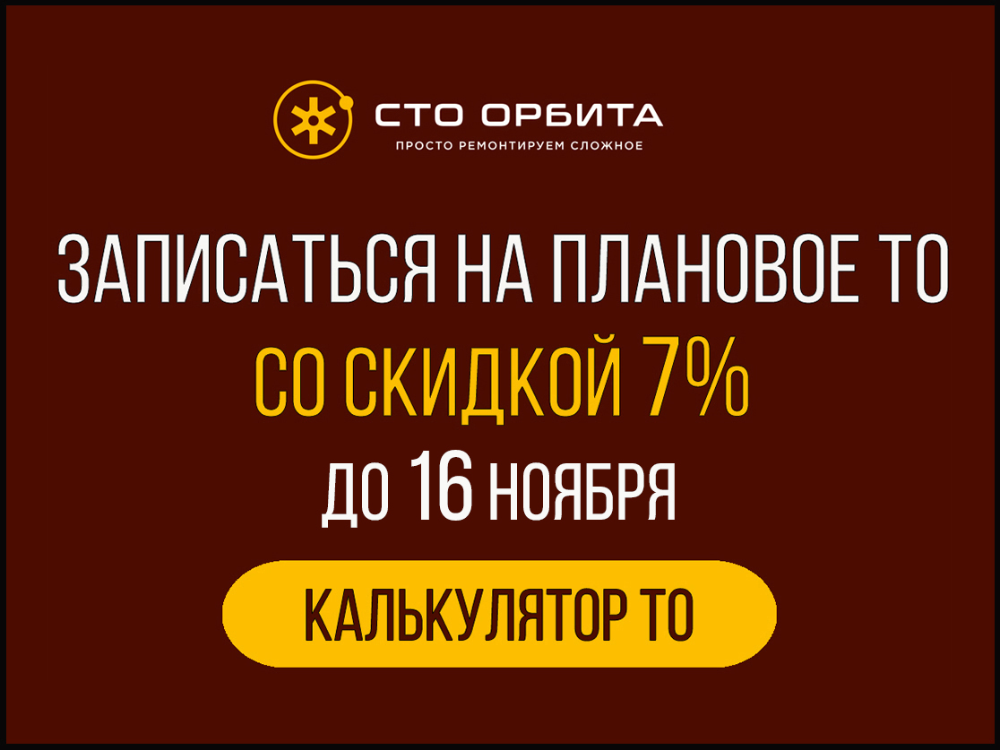 До 16 ноября на СТО «Орбита» действует скидка 7% на плановое ТО (работы + запчасти) только при записи через сайт. Пройди техобслуживание с выгодой для своего кошелька - не упусти выгодное предложение! Удобный калькулятор позволяет в 3 клика узнать актуальную стоимость нужного ТО. Цены и скидки на сайте обновляются каждый день, поэтому на них можно смело ориентироваться при расчете стоимости.